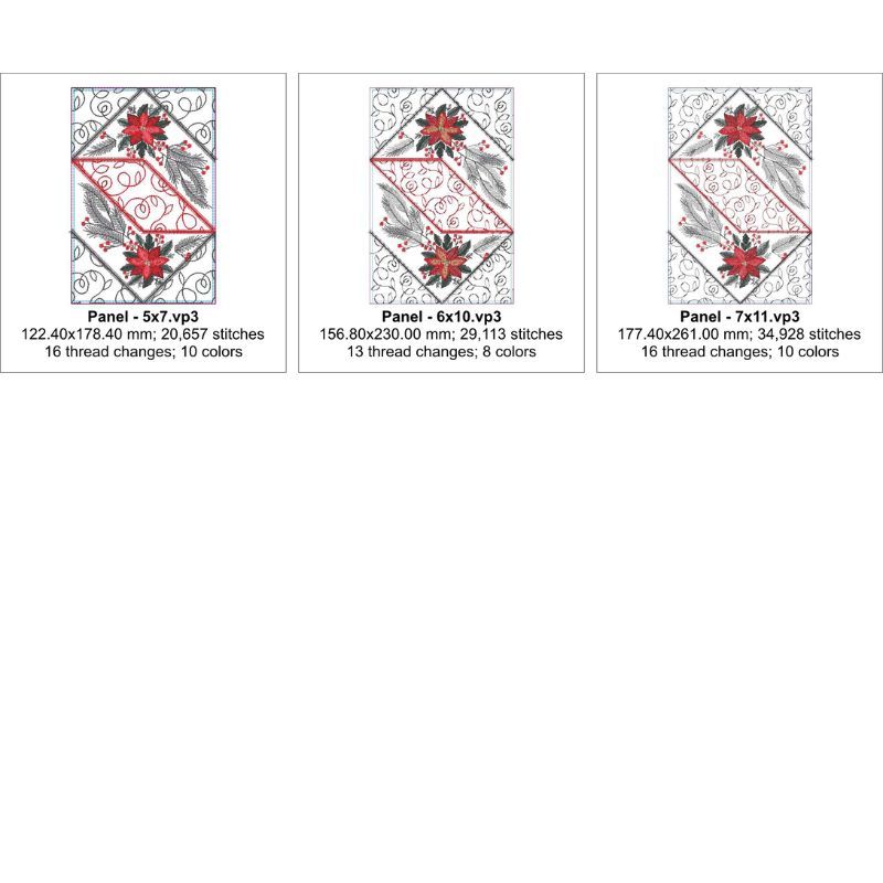 This lovely Christmas poinsettia table runner or topper is quick and easy to make. Each panel is made entirely in the hoop. Fabrics are placed using the applique technique and is edged with a neat feather stitch. There is no flipping of fabric, just place the fabric, tack in place, trim and edge. It's that easy. The fabrics are also quilted in the hoop.