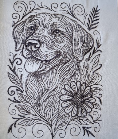 This dog line embroidery design looks like she's just flopped down in the flowers and decided she's staying there forever. With her swirly, wind-tousled fur and that slightly mischievous little smile, she brings a playful charm to any hoop, bag, cushion or towel. Stitch her in variegated thread and watch those flowing lines and petals come to life she practically wags in stitches.