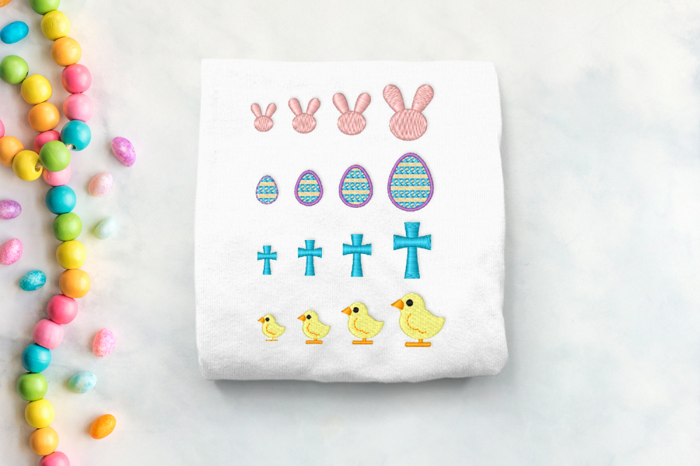 This set of micro embroidery designs includes 4 Easter-themed mini embroidery designs: A minimal bunny face, a decorated Easter egg, a cross, and a baby chick. Chick feet and egg border change from satin to bean stitch at the smallest size.
