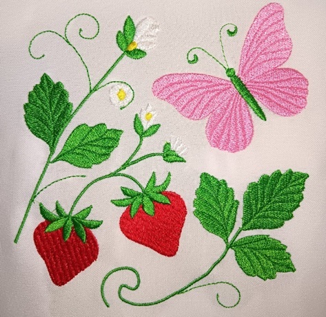 A playful butterfly fluttering above sweet strawberries and curling vines. Let her flit on her own or gather the whole garden crew.