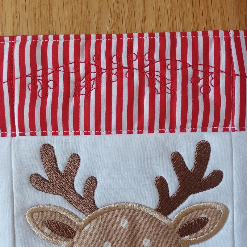 Make this fun ITH Reindeer placemat for Christmas. Each panel is made entirely in the hoop. The reindeer is done in applique. The border pieces are quilted in the hoop. This table runner has 3 center panels and a quilted border.